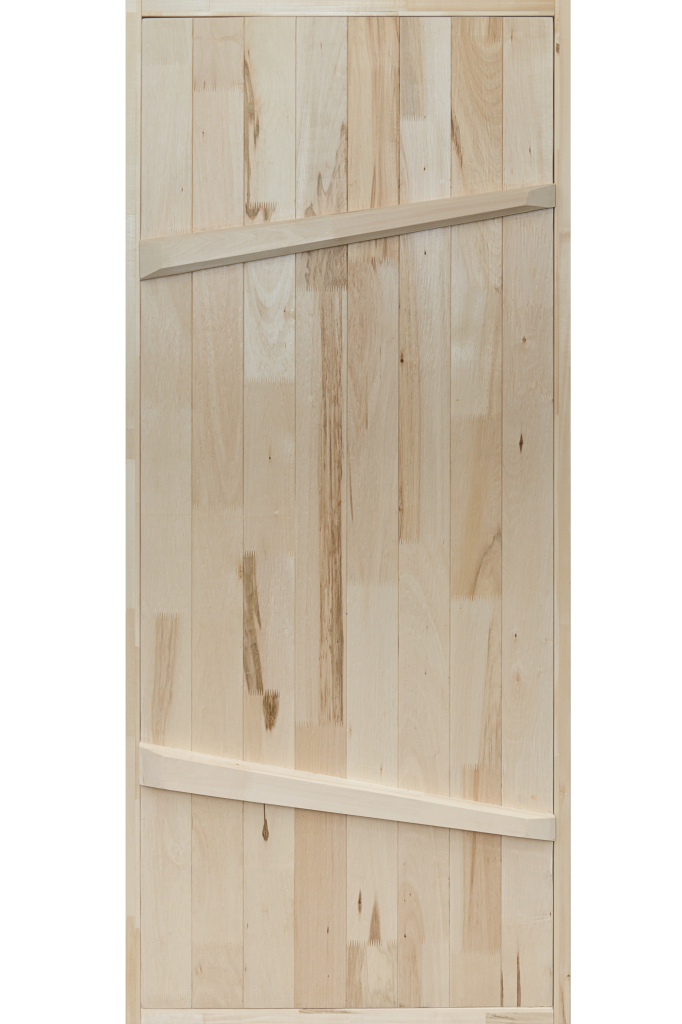 Банная дверь на иглах, из массива липы категории Б изготовлена из 3 слоев древесины с поперечно расположенными волокнами.