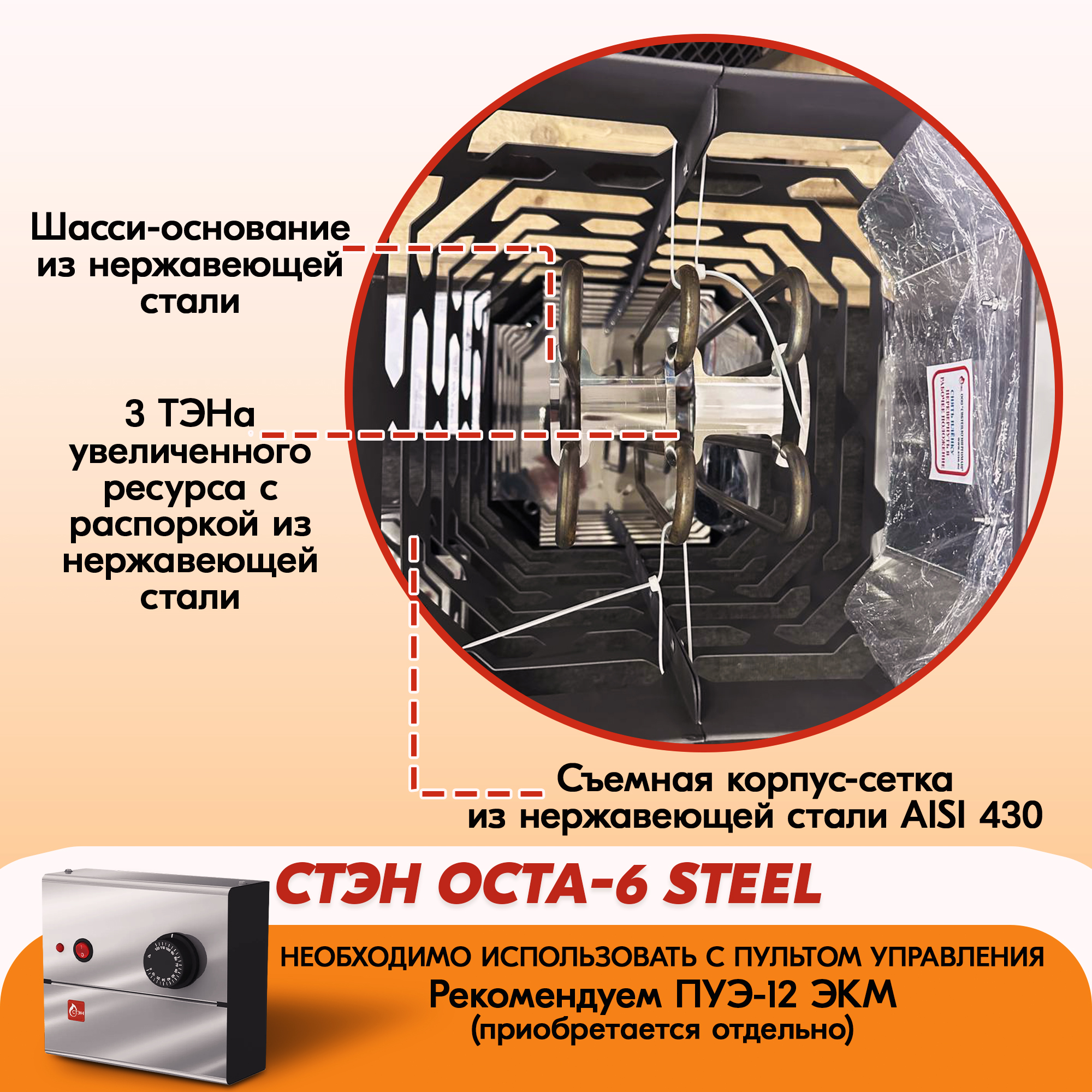 Электрическая каменка СТЭН ЭКМ 6 Octa steel в Миассе | Доставка по России