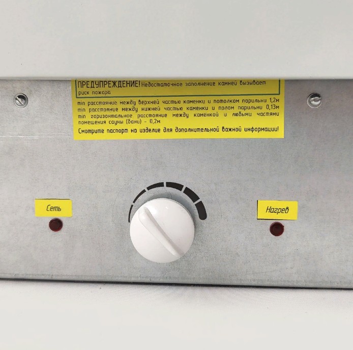 У каменки есть встроенный пульт управления, который позволяет регулировать температуру и экономить электроэнергию. Установленный термовыключатель защищает каменку от перегрева.