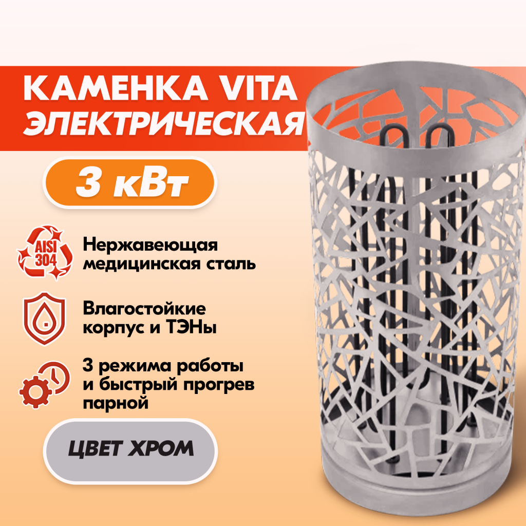 - VITA 3 кВт подходит для парной объемом от 2 до 5 куб.м и вмещает 25-30 кг камней, каменка подключается к сети 220 В.