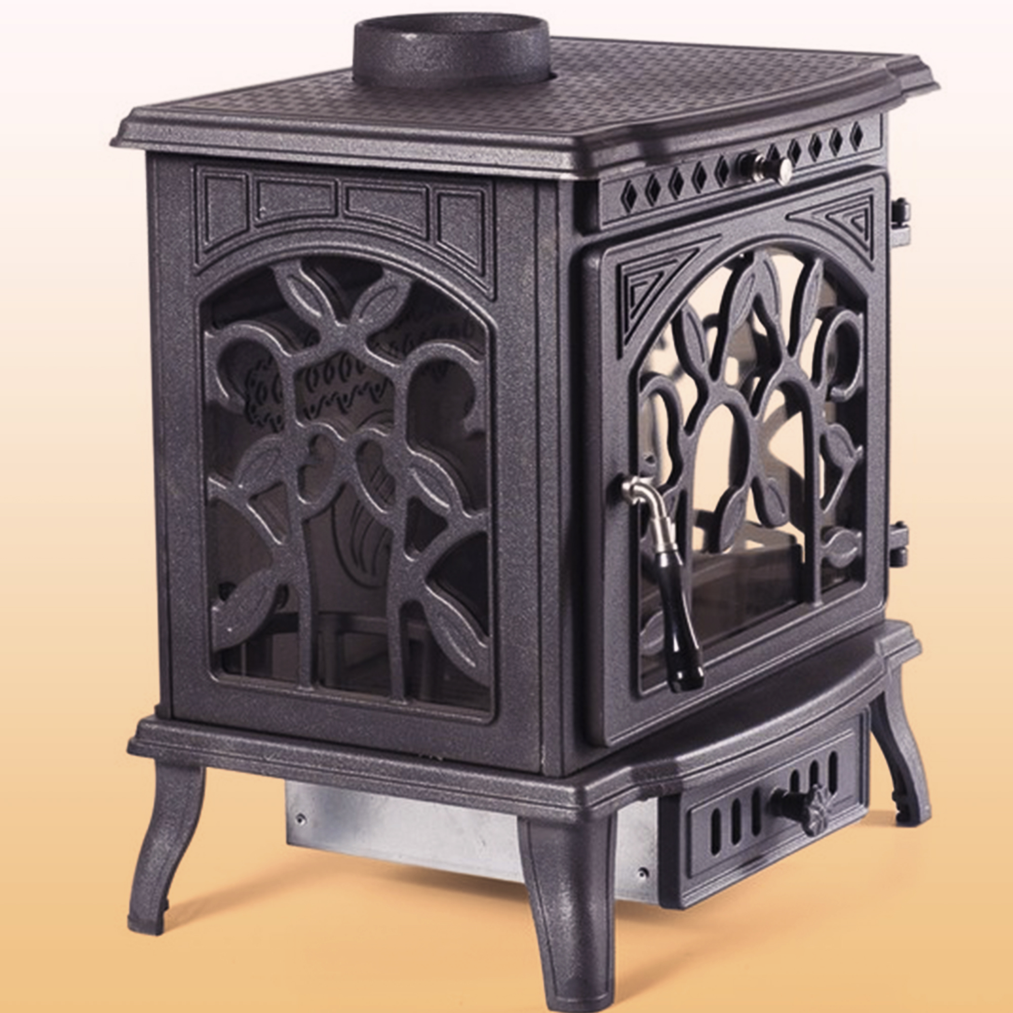 Боковые стенки и дверца печи-камина оформлены большими окнами из огнеупорного стекла, дополненными цветочным узором из чугуна.
