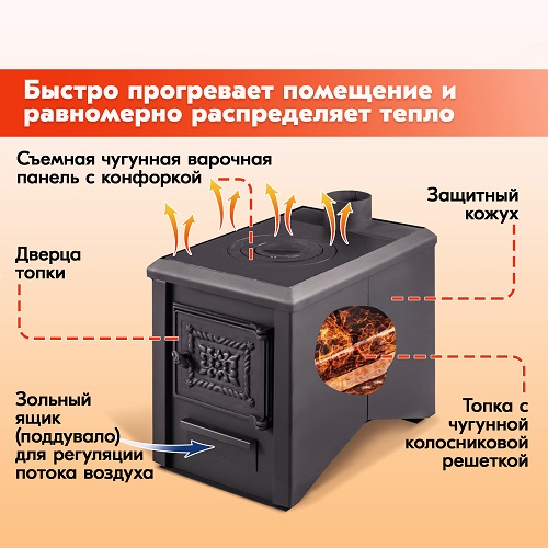 Печь отопительная Радуга ПО-5 - это сварная конструкция из стали с чугунной варочной панелью и специальным защитным кожухом, быстро прогревает помещение и равномерно распределяет тепло.