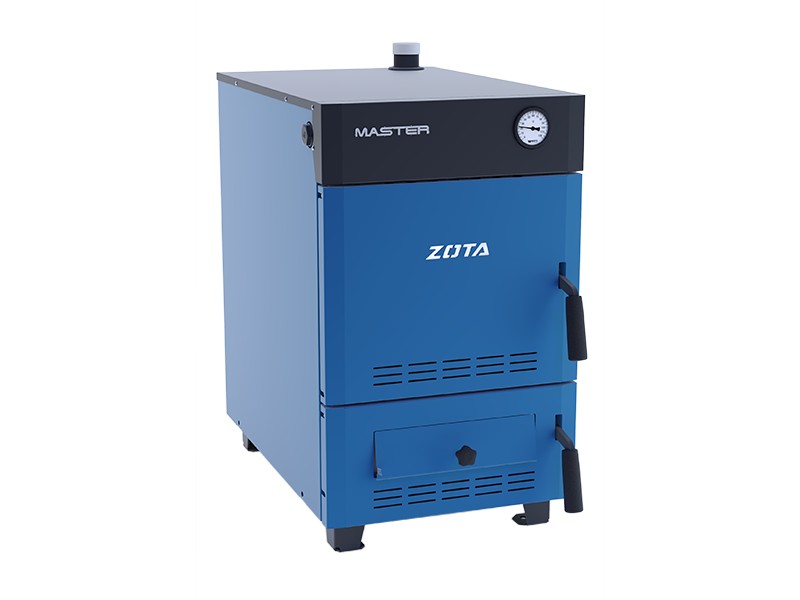 В качестве топлива могут быть использованы уголь и дрова. Сварной корпус изготовлен из высококачественной котельной стали. Центральное расположение камеры загрузки топлива. Удобная чистка теплообменника. Система канальной подачи вторичного воздуха. Высокая степень газоплотности. Большой объем камеры сгорания. Повышенная теплоотдача. Подвижная колосниковая решетка для удобства чистки. Возможность установки блок-ТЭНа мощностью от 3 до 9 кВт с пультом управления. Наличие термоманометра с удобочитаемой шкалой на фронтальной части котла. Высокое рабочее давление (подходит для эксплуатации закрытых систем отопления со стандартной группой безопасности на 3 атм.). Зольник располагается на водоохлаждаемой поверхности, что улучшает газоплотность и повышает кпд котла. Тягорегулятор устанавливается в качестве опции. Популярная отечественная торговая марка ZOTA выпустила в свет обновленную линейку современных котлов отопления – Master, которые отличаются высоким КПД, практичностью и долговечностью. Серия представлена пятью моделями, где все агрегаты оборудованы варочной панелью и съемной конфоркой, за исключением котла